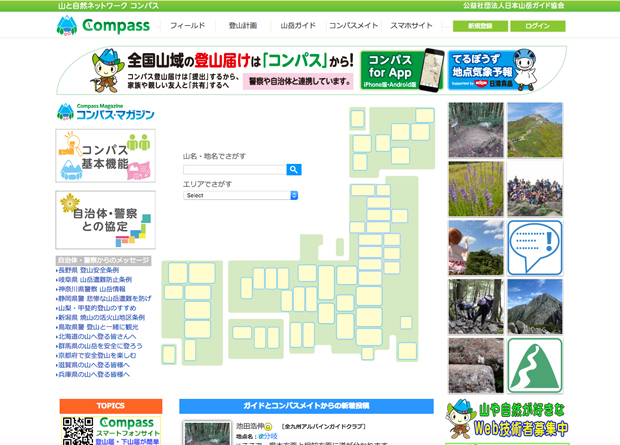 日本山岳ガイド協会が運営するウェブサイト、Compass。ネット上で登山計画書を作成でき、そのまま警察署に提出もできる。