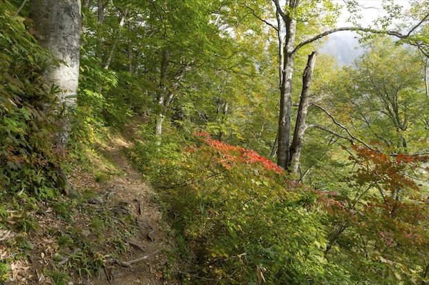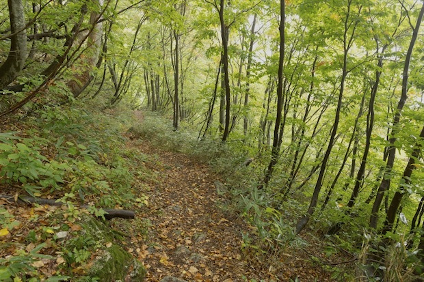 景色の変わらない樹林帯の単調な下山道のなか、足を取られる根っこや段差の大きな岩場、滑りやすい泥道など、疲れたカラダをさらにムチ打つ斜面をひたすら下り続ける下山は、忍耐力と足の筋力との戦い。この時間を好きだという人はなかなかいないでしょう。