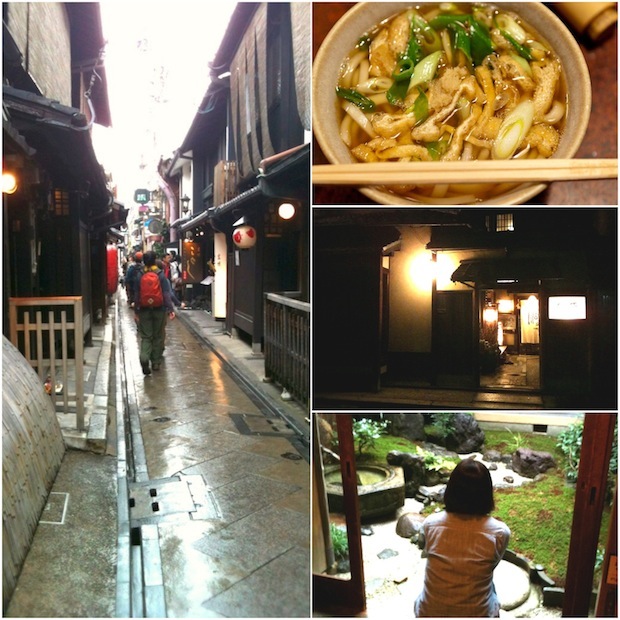 下山したあとは京都市の中心地へ。左)鴨川と木屋町通の間にある中京区の花街「先斗町(ぽんとちょう)」。右上)地元民ものれんをくぐる昭和初期創業の老舗そば処「権兵衛」はうどんもおいしい。右中・右下)中京区にある「石原」は片泊り(朝食付き)の風情あふれる旅館。日本映画界の巨匠である故・黒澤明監督 の愛した定宿だ
