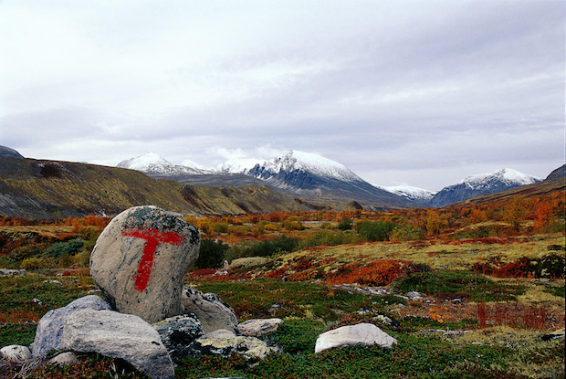 赤いTの字はノルウェートレッキング協会による道しるべ。©Anders Gjengedal
