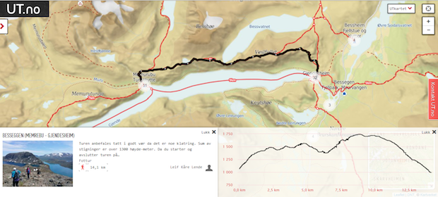 このWEB上の地図はノルウェーでの登山計画を立てるのにとても便利。たとえば前回、少しだけご紹介したヨートゥンハイメン国立公園(Jotunheimen)ベッセゲン尾根(Besseggen)のコースは、ルートや高低差がこのように表示されます。
