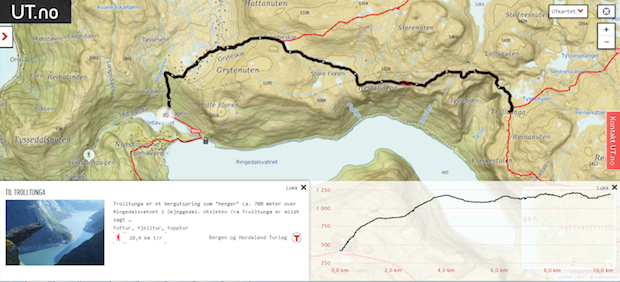 ハダンゲルフィヨルドエリアにある「トロルの舌(Trolltunga)」へのコースはこんな感じです。