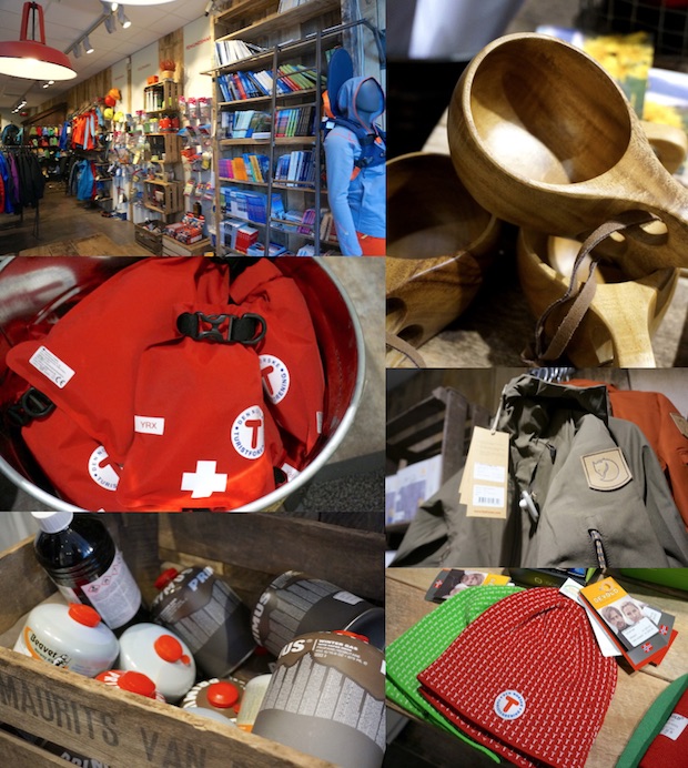 (左上)アウトドアグッズの販売もしているDNTのインフォメーションセンター。日本から忘れ物をしても大丈夫。(右上)北欧先住民族サーメの伝統工芸品「ククサ」。山にも持っていけるし、使わないときには家に飾っておけるカップです。白樺のコブでつくられていて、「贈られた人が幸せになる」ともいわれています。(左中)DNTオリジナルのファーストエイドキット。(右中)フェールラーベンのジャケット。落ち着いたアースカラーで旅にも重宝しそう。(左下)飛行機に乗せられないガス缶は現地調達するしかありません。ここで買えます!! (右下)DNTオリジナルのニットキャップ。DNTの会員になると割引価格で購入できます