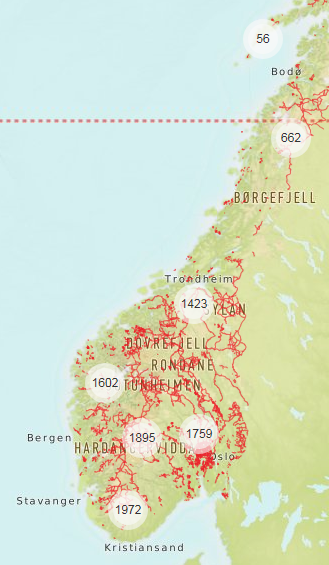 それらのコースはDNTのWEBサイトからも閲覧可能。縮尺を拡大していくと毛細血管のようにさらに赤く表示されたコースが張り巡らされていて、それはもうすごい数。下のそれぞれの地図をクリックすると、詳細が確認できますよ。