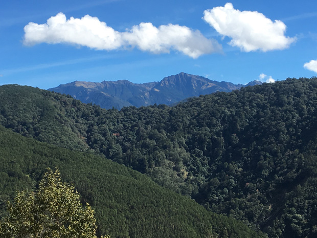 雪山登山口から見る南湖大山(中央)を含む北一段の山並みは、雰囲気としては日本の南アルプスを彷彿させる