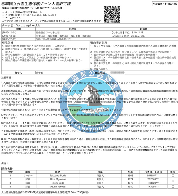 入園許可は提出された申請の内容を審査し、約3日後に合否が出されます。計画書の不備がないか、設定された行程に無理がないか、また外国人の場合は在台湾の留守人員(家族などではなく、救援体制をとることのできる在京本部)の連絡先などを細かく審査された上で許可が下ります。