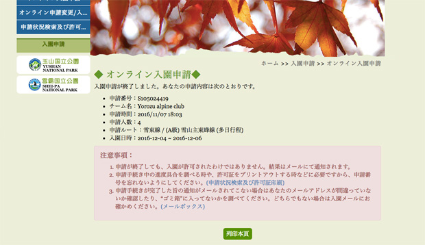 ところがこれで終わりではありません。入園許可証が交付されたら次に警察署へ入山許可証の申請をしなくてはなりません。入園許可証が送られてくると同時に、警察への入山許可申請をオンラインで行なうことができるURLが送られてくるので、そこから申請をします。するとすぐに入山許可がメールで返信されるので、入園許可証と、入山許可証、それとメンバー表をそれぞれ2部づつプリントアウトし、登山口でそれらを提出すれば登山が可能となるのです。