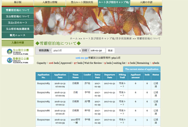 私たちが当初予定していた行程は、雪山へのノーマルルートで、初日は登山口から登りはじめ、最初の山小屋である七卡(シチカ)山荘を過ぎ、その次の三六九山荘に宿泊、翌日、頂上にアタックして七卡山荘まで下り、3日目に下山をするという予備日も含めた計画でした。このコース設定で申請をするとなると、三六九山荘に宿泊できる上限の数が、その日の入園許可の上限数となります。つまり三六九山荘の収容可能人数は106名ですから106人分の許可しか出ないのです。また、申請は宿泊日のちょうど1ヶ月前から7日前まで申請でき、3日ほどの審査の後、先着順で受理されます。また、注意しなくてはならないのは、申請ができるのは行程上の最終宿泊日から起算して1ヶ月前から。ここもかなり重要で、ちょうど入山日の1ヶ月前だと思ってPCの前に座って入力を始めたものの、いっこうに申請ができず、ようやく、そのことに気づき、翌日に再度申請を行なうことに。