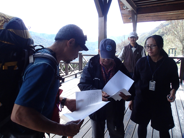 南国の台湾とはいえ、標高もそれなりに高いことから雪が降ってもおかしくないのでは? という心配から、念のためピッケルとアイゼンを携行していましたが、どうやら大丈夫のようです。翌日以降も晴天がのぞめたことからも、ピッケルとアイゼンは七卡山荘にデポしていくことに。小屋番のお兄さんに相談すると、荷物に持ち主を明記して置いていくように言われました。降雪の時期については、なかなか有益な情報がつかめませんでした。季節の変わり目の場合は、念のため携行して現地で判断するのがよいと思います。