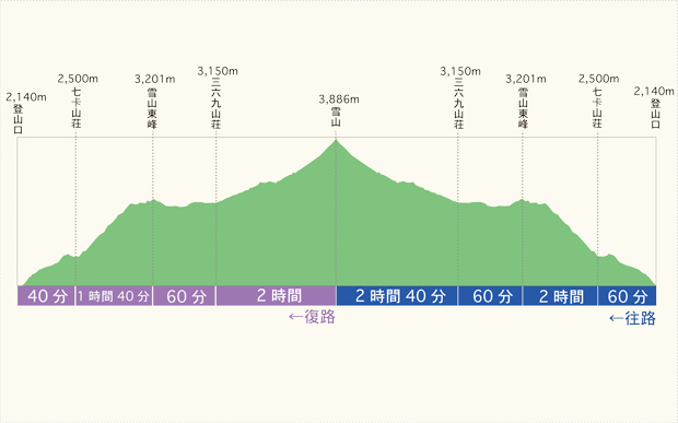登山口から雪山主峰往復のおおよその所要時間と高低差です。図右からスタートし、山頂を経て、また登山口に戻りました