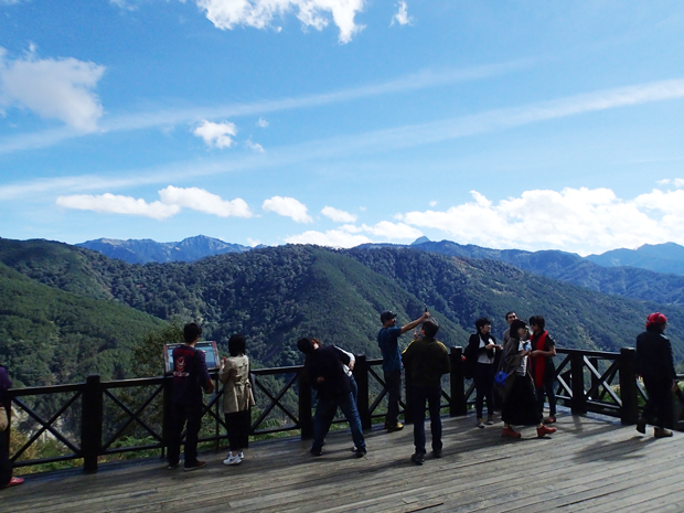 標高はすでに2,140メートル。心なしか空気は薄いです。遙か遠くには剱岳のようにそびえる南湖大山がくっきりと見えました。この先は登山口のみで、道路はありません。観光客は、この登山口付近まで車で来て眺めを楽しむようです。記念撮影をしている人がたくさんいました。