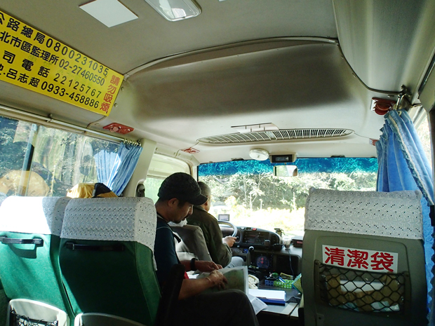 武陵農場のバス停から登山口までは、約7キロの舗装路でちょっと距離がありました。この区間は定期バスもなく、山奥なのでタクシーもいません。計画段階からこの区間はネックでした。車であれば20分弱で移動できるところですが、歩くしかありません。3日間の食料や、心配で携行したアイゼンとピッケルもありザックはずっしり。「運良くヒッチハイクできたら……」と、観光客の車にアピールしながら歩きはじめますが、大型ザックを背負った4人を乗せられる車なんてそうそう来ません。歩きはじめて30分。「もう歩くしかないか……」と諦めかけたころ、目の前に1台のマイクロバスが停まりました。「乗せてくれるのか?!」色めき立つ一行。