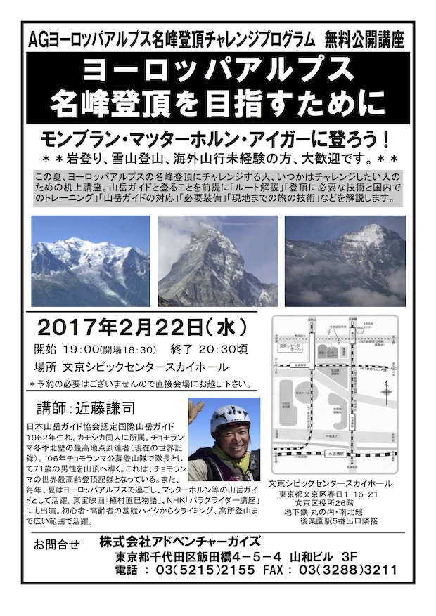 毎年、この時期に開催される近藤謙司さんの無料公開講座「アドベンチャーガイズ・ヨーロッパアルプス名峰登頂チャレンジプログラム」。今年の開催は2月22日、明後日の水曜日夜7時から。