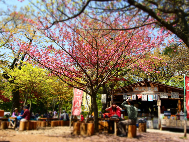 2015年4月26日の高尾城山の山頂の写真。新緑と花がとても美しい!おでんやなめこ汁のノボリも魅力的!。高尾山から1時間ほどで到着する山で、ココまで来るとハイカー人口が多くなる