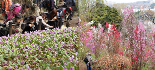 左はカタクリの花。カメラを携えた人で賑わう。もうすぐ満開になるホウキモモ。これもカタクリの里で2013年4月1日に撮影