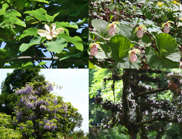 左上から時計回りに、高尾山と城山の中間「一丁平」で撮影した朴の花。花好きに聞いたろころ珍しいらしいクマガイソウ。南高尾のとある神社で咲いている。高尾山の名物セッコク。6号路で上を眺めていると見つけられる。藤も多い
