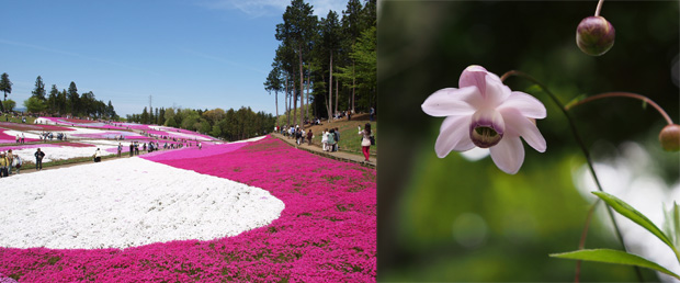 秩父の芝桜の丘はとても広くて美しい。西武鉄道横瀬駅や西武秩父駅から徒歩約1.5kmほどだ。右は奥多摩の御岳山でのレンゲショウマ。丸くとても可愛い花を咲かせる