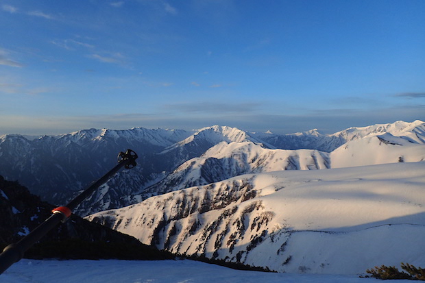 そんなこんなで何度も何度も登り下りを繰り返し、槍ヶ岳に到着したのはすっかり陽も落ちた20時過ぎ。最後の楽しみにしていた槍沢滑走は、クラストと雪崩跡で、ガタガタ、ボコボコで恐ろしくひどいコンディション。疲れたカラダにはきつい斜面だ。