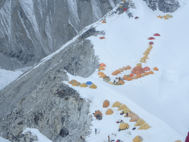 写真はC1。切り立った稜線上の狭いスペースに多くの登山隊のテントがひしめき合う。風が強く吹く時もあり、この日はテントが1つ飛ばされて、下の方に転がっていた。