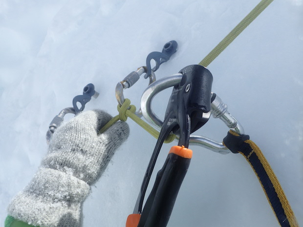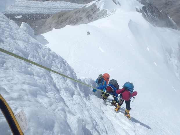 このルートを示すフィックスロープにユマール(登高器具)をつなぎ、ところどころで付け替えてすすむ。「頭がもうろうとしているから簡単なはずなのにできない。もう酔っぱらいみたいな感じですよ」
