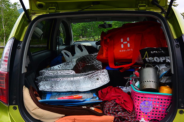 かわいらしいコンパクトカーは、外見とは裏腹に、雑多な生活道具と山道具で埋め尽くされていた。