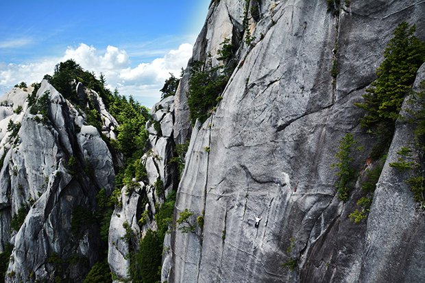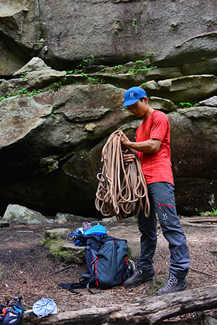 1日のうち、本気でトライできるクライミングは2、3本。指先の感覚を研ぎ澄ませる一方で、岩肌に磨き削られた指の皮をいたずらに消耗させたくない。岩を、自身を見極め、ていねいに登ることを心がけているという。