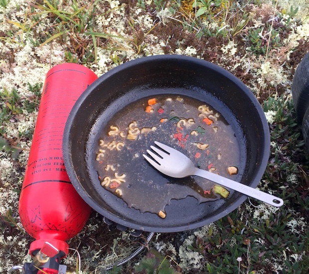 気づくと曇っていたが雨は止んでいた。冷たい風は吹いたまま。ベアセーフティの基準にそって40mほど離れた場所で夕飯。インスタントラーメンとお茶で済ます。