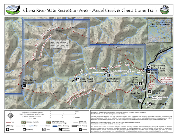インターネット上に掲載されているトレイル「Chena Dome Trail」の情報によると、は29マイルの周遊コース。アルパイン的なすばらしい眺望や、高山植物、1950年代に起きたというとある事故の残骸がトレイル上にあるらしい……