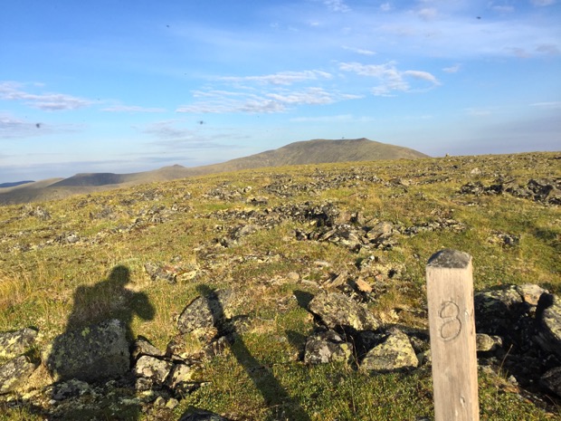 後半のコルエリアは木が多く、クマが怖かった。手を叩き、声を出して抜ける。途中ブルーベリーを食べながら。再度の電話連絡。衛星電話は便利だ。僻地からでも繋がる。16時半から17時には下山場所に到着予定と伝える。