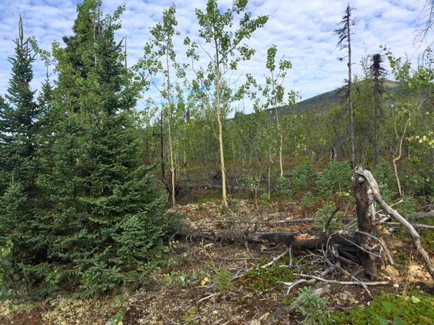 もう1日伸ばしたからか心の余裕があり、身体も慣れ、気持ちも変わり、アラスカのトレイルを歩く充実感が強くなっていた。そして、この後半のキャビンからのトレイルはハッキリとトレイルとわかるところが多く、歩きやすい。前半とは違い植物が多くなる。全体的に標高が下がっていることがこの植生に現れていた。