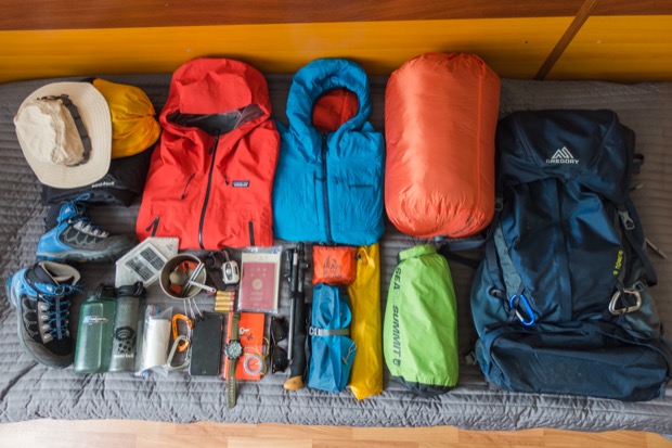 今回携行した全装備。テントはHOBO'S NEST、シュラフはmont-bellダウンハガー#3、マットはmont-bell ULエアパッドを使用。シュラフの袋が大きいのはエアマットを膨らませるのに使うため。調理は団体装備で行ったために持っていない。アルパインウエアはpatagoniaクラウドリッジ上下、保温着はpatagoniaナノエアライトハイブリッドフーディ、トレッキングブーツはASOLOを使用した