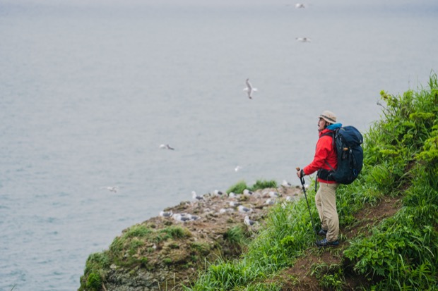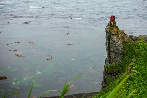 せっかく登ってきたが、山の中腹には分厚いガスが立ち込め視界がまったく利かなかった。この先の稜線はナイフリッジが続いていて、このコンディションでは危険だという。しかたがないのでそれ以上の登山を中止し、この日は海岸沿いのコースタルトレッキングを楽しむことにした。