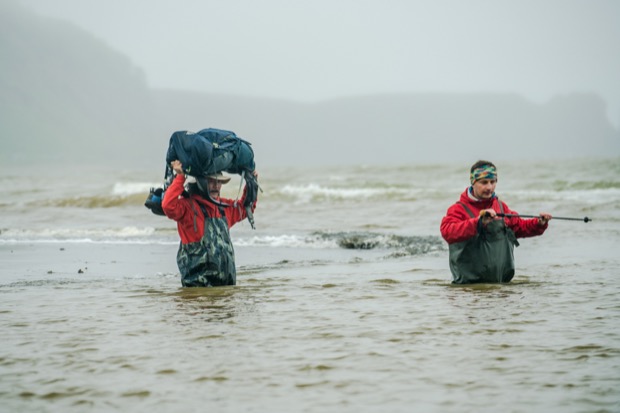 仕方ないのでトレッキングウェアの上にバカ長を履き、ソロリソロリと歩を進める。川底は海草で滑りやすく、バランスを取るのに苦労をした。登山靴とバックパックは頭の上に乗せていたが歩く度にグラグラと揺れた。インディー・ジョーンズじゃあるまいし(古い!)いきなり徒渉かよ。