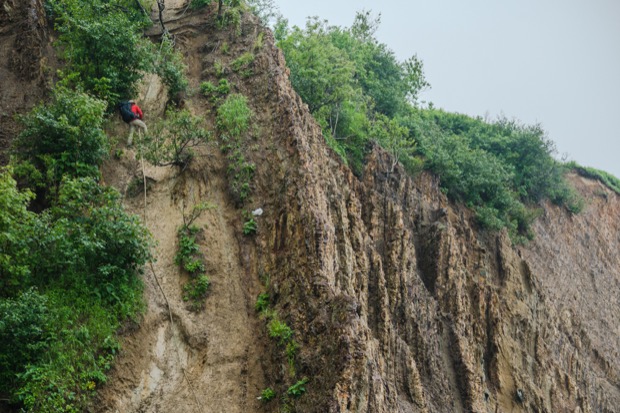それを痛感したのはその1時間後、今度は斜度50度もある崖の前でセルゲイさんから「ほらこれ」と軍手を渡されたときだ。崖の高低差は10メートル以上あるだろう。表面の土は粘土質で降り続く雨を受けてヌラヌラと光っている。そしてそこに運動会の綱引きに使うような太いロープがダランとぶら下がっているのだ。