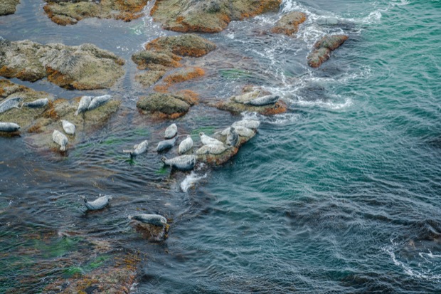 見下ろすと岩礁にゴマフアザラシがゴロゴロしていた。30頭はいるだろうか。北海道では流氷が流れ着く季節にしか見ることはないが、ここでは夏でもこうしてゴロゴロしているらしい。ゴマフアザラシの赤ちゃんは真っ白い毛に被われてフカフカしているから日本でも人気だが、これはアザラシは冬に流氷の上で出産するため、外敵に襲われないように保護色になっているのだ。ここサハリンでの彼らの天敵はシャチとヒグマ。赤ん坊は大型猛禽類に襲われることもあるらしい。でも岩礁に寝転んだアザラシたちは完全に弛緩していた。