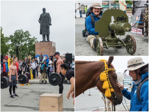 左)この日はレーニン公園でお祭りが開かれていた。ミルコ・クロコップみたいなムキムキのお兄さんたちが公開トレーニングや力比べをしている。何故だ?? 右上)地元の子どもたちに混じって戦争ごっこ。オマエは何歳だ! 右下)パレード用の馬をみつけ、おもわずナデナデ。ああ、また馬で旅したいなあ
