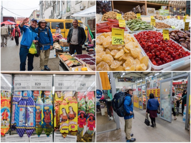 街の中心にあるマーケット(自由市場)には肉、野菜、果物、菓子、香辛料、日曜雑貨などを扱う小さな店がぎっしり詰まっていて見ているだけでも楽しい。中東系、中央アジア系、中国系、朝鮮系など白色ロシア人以外の人種が目立つ