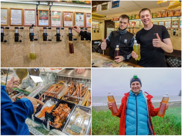 ロシア人はウォッカばかり飲んでいるのかと思うと、さにあらず。若い世代にはビールが人気で、さまざまな地ビールが売られている。量り売りの店ではこんなふうに発泡飲料用のペットボトルで販売してくれる。酒のツマミとしては鮭トバ、タラの干物、イカソーメン、燻製ニシン、スモークサーモンが人気だそうで、ショーケースの中は北海道とまったく変わらない