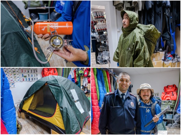 ユジノサハリンスクでアウトドアショップを探したが、まったく見つからない。英語が通じない上に、ロシア語(キリル文字)が読めないからネットでの検索も困難を極めた。途方にくれていたらおまわりさんが声をかけてくれ、一緒に店探しをしてくれた。そして見つけたのがこの『Bezdna』だ。左上)中国製のガソリンストーブ。メーカー名不明。お店の人は使い方をよく知らなかった。6,900ルーブル(約12,500円)。右上)TATONKAのポンチョ。背中のホックを外すとラクダのコブのように広がり、90Lクラスのバックパックを背負ったままかぶることができる。2,600ルーブル(約5,000円)左下)テントや寝袋はALEXIKAというロシア製品が多かった。これはSCOUT2/3という2~3人用テント。右下)ショップ探しをしてくれたおまわりさん。なぜか警棒を貸してくれた