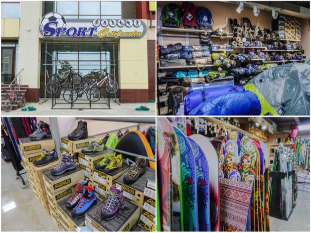 左上)セルゲイさんに教えてもらった大型スポーツ店『SportCalifornia』。街外れにあるが自転車からSUPまで大抵のものは手に入る。右上)JackWolfskinやNIKE製品が特に充実していた。左下)アゾロの本格的なトレッキングブーツも売っていて品揃えは抜群。右下)スノースポーツ用品も充実。クロスカントリースキーやスケートが人気だそうだ。こんなマトリョーシカ柄のスノーボードもあった