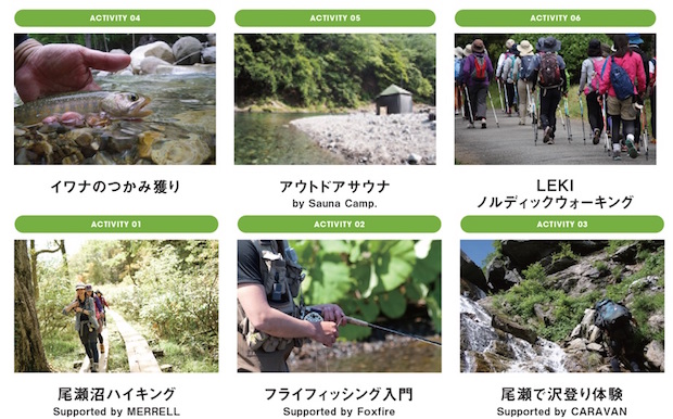 イベント中に体験できるアクティビティは6つ。尾瀬沼ハイキングや会場近くでの沢登りなどよりどりみどり。また、メイン会場では子どもも楽しめるトランポリンや、アウトドアファンにうれしいオリジナルのカトラリー体験など盛りだくさんだ。