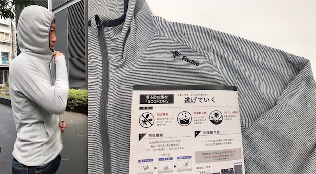 「スコーロン」といえば、帝人とアース製薬が共同で開発した虫を寄せ付けない繊維。そんな防虫素材スコーロンで作られた薄手のパーカーです。