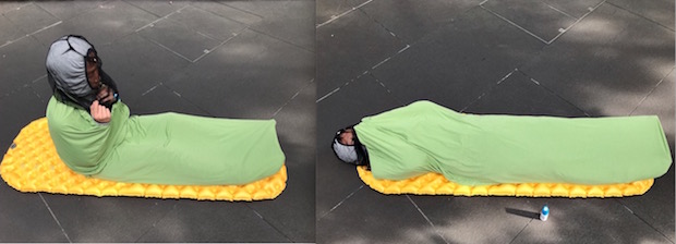 見た目は普通のインナーシーツですが、収納サイズはUL派でも十分納得できる大きさ。携行に便利なこのシーツは、顔部分をのぞいてすっぽりと入り込めて、夏の夜にぴったりの絶妙な暖かさもあります。