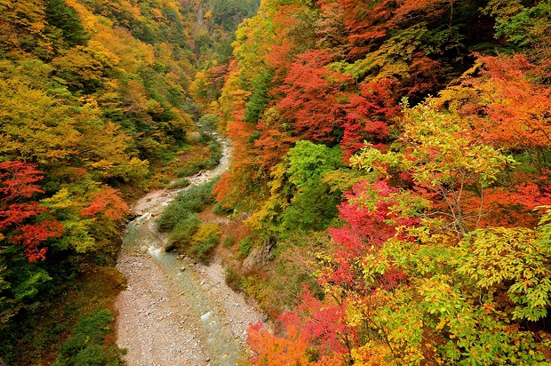 エメラルドグリーンの高瀬川に鮮やかな紅葉が映える静かな高瀬渓谷は、県内有数の名勝地。ダム堰堤から見下ろした紅葉と、尾入沢大橋から見る渓谷の紅葉がお勧めポイント。
