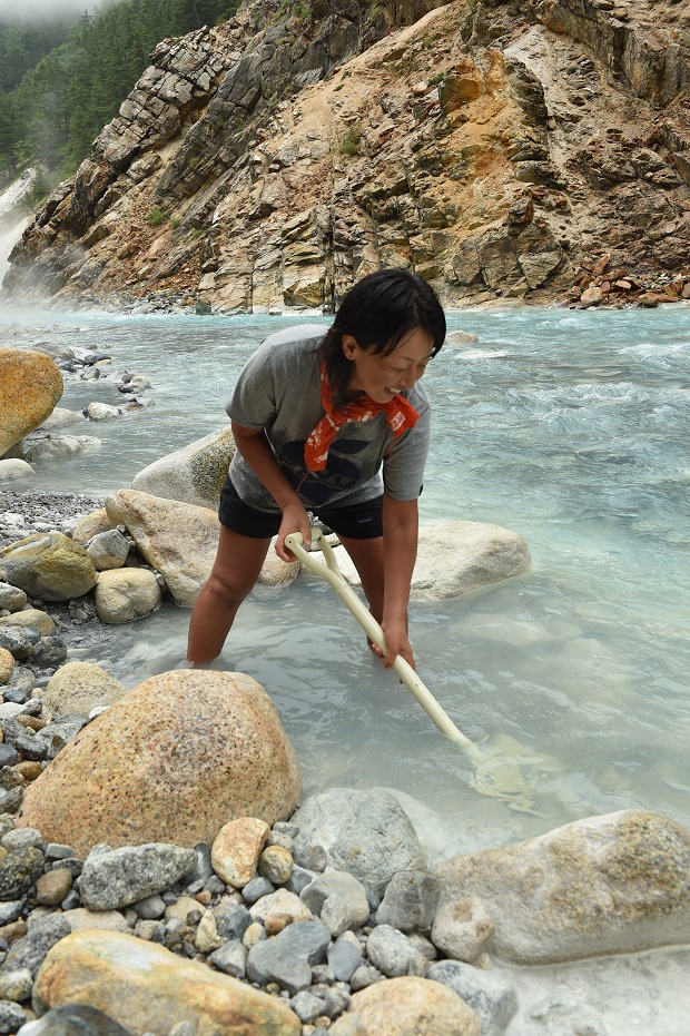 宿から湯俣川を少し遡った地獄谷と呼ばれるあたりは、炭酸石灰などの沈殿物が長い年月をかけて堆積した白い墳湯丘が見られる。源泉が河原のあちこちに湧いているので、スコップを宿から借りて、自分だけの露天風呂をつくろう。