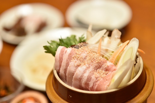 夜も更け、宿に戻って夕食の時間です。わっ、すごい量だし、山小屋とは思えないほどのお料理。豚バラ肉のお鍋・西京味噌と胡麻仕立て、讃岐うどん、ベルギーのレモンシャーベット、ふきみそ・山イモ梅酢・塩丸イカ・山ゴボウ味噌漬け、行者ニンニクの醤油漬けなどと豊富。手作りの唐辛子味噌が鍋に添えられてあって、おつまみのように少しずつ目にも楽しい料理の数々。ここが信州の山奥ということを忘れてしまいそう。