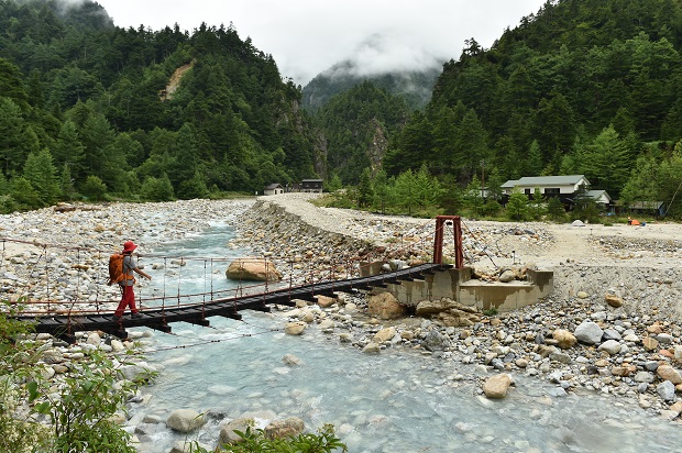 このルートは裏銀座の野口五郎岳へつながる竹村新道や槍ヶ岳に向かうコースでもあり、登山者たちと何度もすれ違います。なだらかとはいえ3時間ほど歩けば、ザックは肩にくいこみ、足はもうガクガク……疲れ切ったところで、右手に小さな赤い吊り橋が見えてきました。あの橋を渡ると、そこが晴嵐荘です。