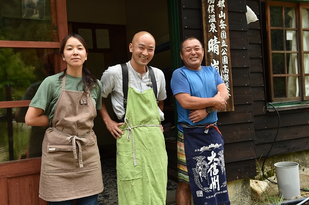 左から優しい笑顔の癒し系スタッフ・日下知子さん。宿を取り仕切る支配人の山根雅之さん。おいしいコーヒーをドリップしてくれたスタッフの森本克寛さん。