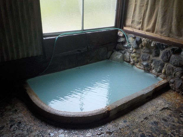 岩つくりの内湯に入れば、白濁した湯が肌に染み込んでいくよう。硫黄の匂いのわりに滑らかな湯ざわりである。泉質は単純硫化水素泉、泉温は42度ほどで心臓弁膜症や関節、筋肉の慢性リューマチに効能があるという。山奥でこれほど雰囲気のある温泉に入れるとは思いませんでした。山道で心地よく汗をかいたし! これは、きっと、やせるぞ~。