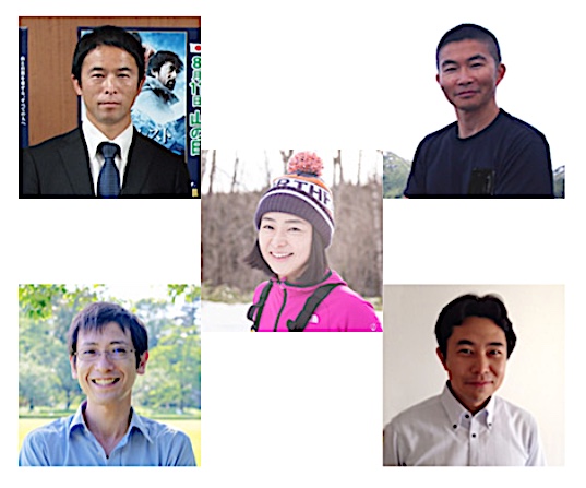 〔左上〕井関純二(いせき・じゅんじ) 山岳保険制度「やまきふ共済会」を運営する一般社団法人山岳寄付基金代表理事。〔右上〕猪熊隆之(いのくま・たかゆき)国内唯一の山岳気象予報専門会社ヤマテンの代表取締役。中央大学山岳部監督。国立登山研修所専門調査委員及び講師。〔センター〕渡辺 佐智(わたなべ・さち)登山ガイド。春から秋は登山ガイド、冬から春はバックカントリーガイドとして、四季を通して日本の山で活動する。〔左下〕荒木健太郎(あらき・けんたろう)雲研究者。気象庁気象研究所予報研究部第三研究室研究官。〔右下〕的場一峰(まとば・かずみね)日本最大規模、毎月130万人が利用する登山記録登録サイト「ヤマレコ」を運営する株式会社ヤマレコの代表取締役。